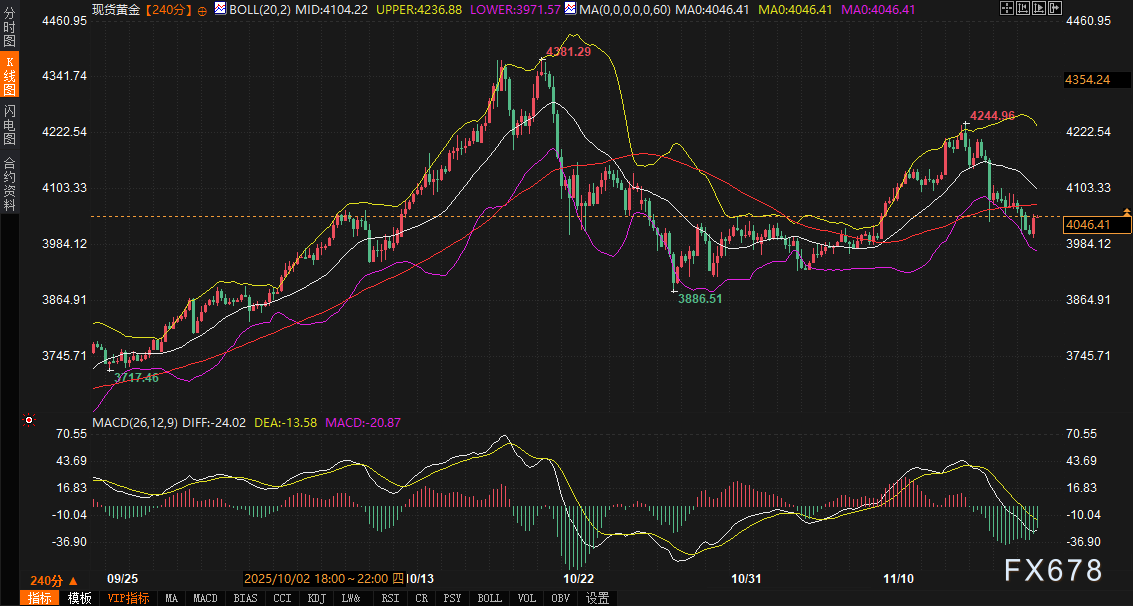 技术面上,4000美元整数关口已转化为支撑,4014中轨多次回踩不破,强化多头控制力。上方压力集中在4100-4120前期高点密集区,以及4236布林上轨。